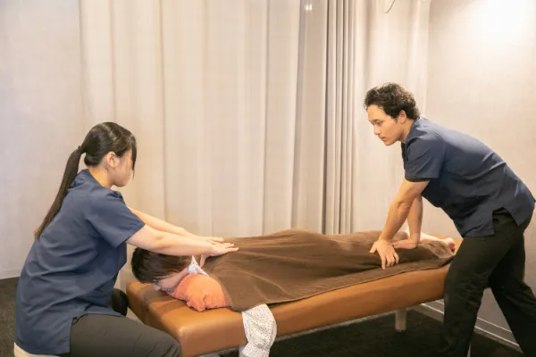 施術者が2人がかりで、上半身と下半身を同時に施術していきます。